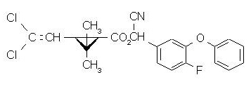 【化學(xué)名稱】:(RS)-a-氰基-4-氟-3-苯氧基芐基(1RS,3RS;1RS,3SR)-3-(2,2-二氯乙烯基)-2,2-二甲基環(huán)丙烷羧酸酯